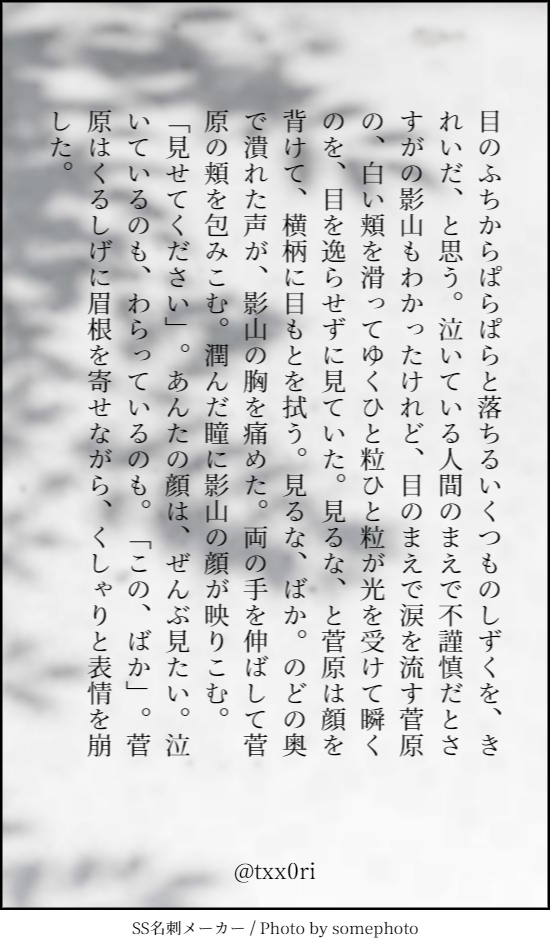 ばんtむ Category:log Date:2018年10月26日 またSSメーカーさんで遊んでました。万紬です。 今日の織の万紬のお題は 「1秒がこんなに長いこととか、1日がこんなに短いこととか、貴方に出会うまで知らなかった」 #創作のお題を決めましょう https://shindanmaker.com/804823 で書いたあれ。 れいぞうこのかげに隠れてキスをしよう。