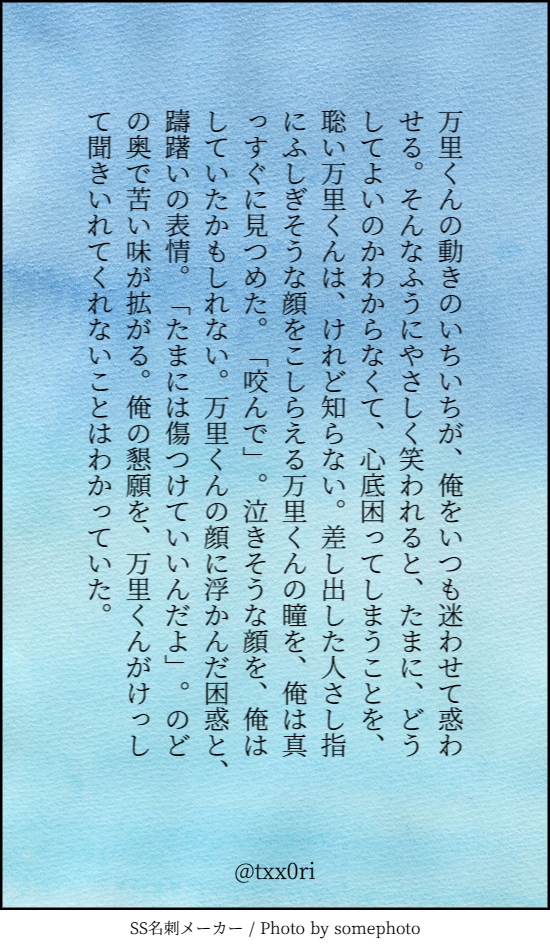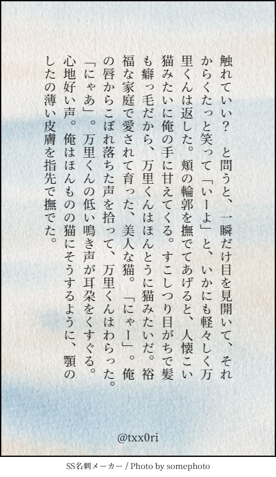 SSメーカー Category:log Date:2018年10月15日 ながめの文章を書くテンションが戻らないので、SSメーカーで遊んでました。 万紬です。 拍手くださったかた、どうもありがとうございます…! とてもとてもうれしいです、励みになります。 PR